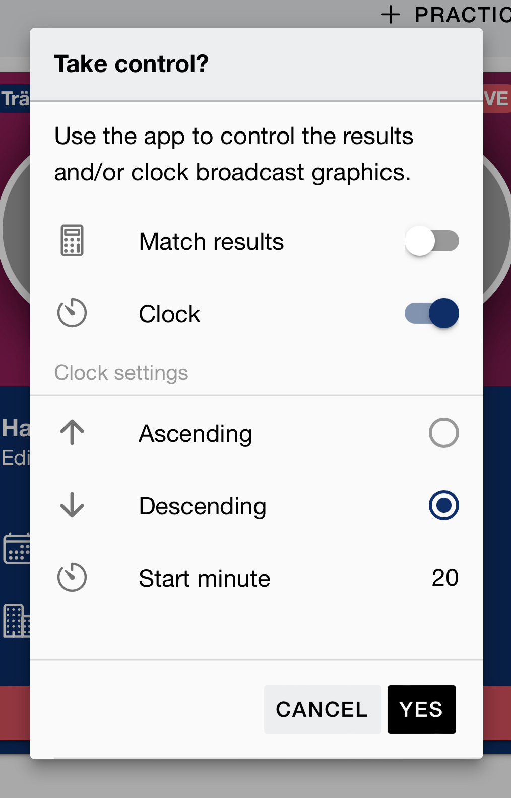 You will then choose if you want to control ‘Match results’, ‘Clock’ or both and then press ‘YES’.