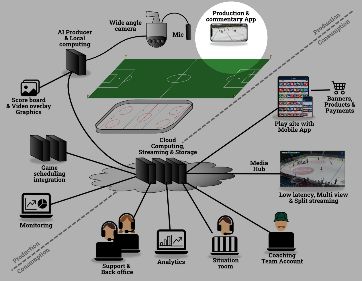 The broadcast will be streamed in the same way as the mounted camera to the cloud and to be consumed via the play site, play-app, or team account