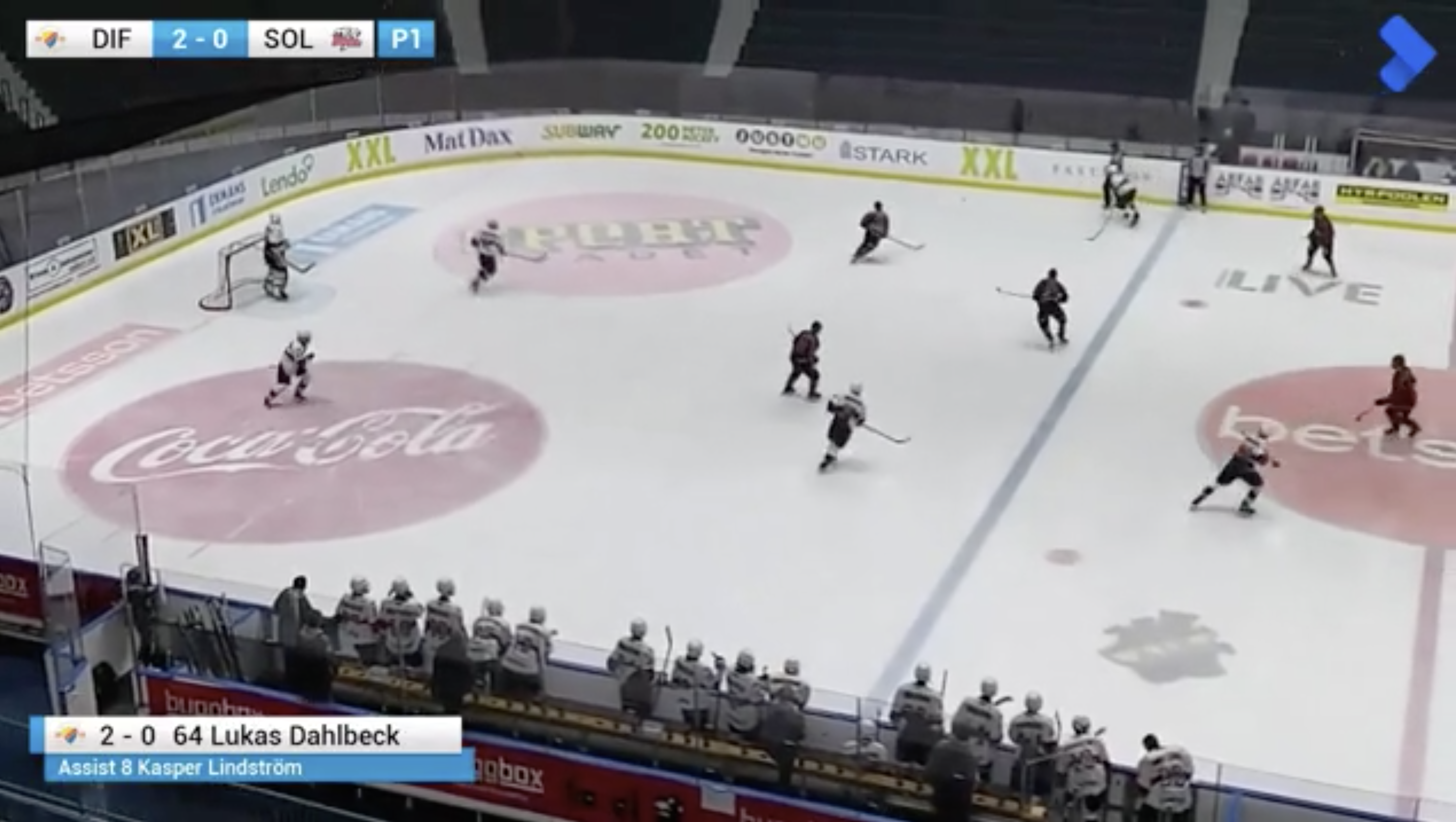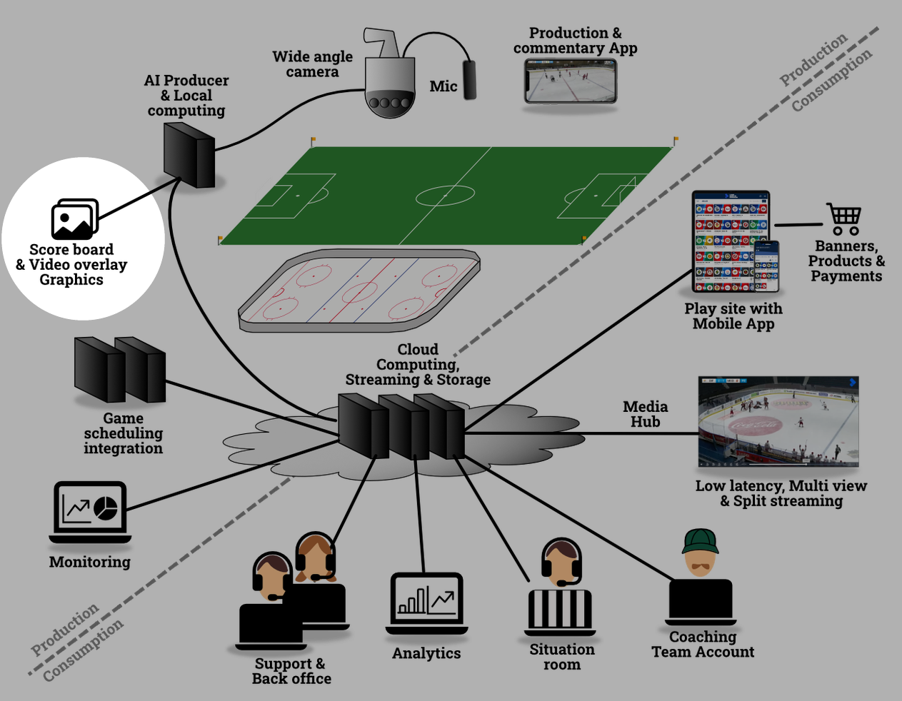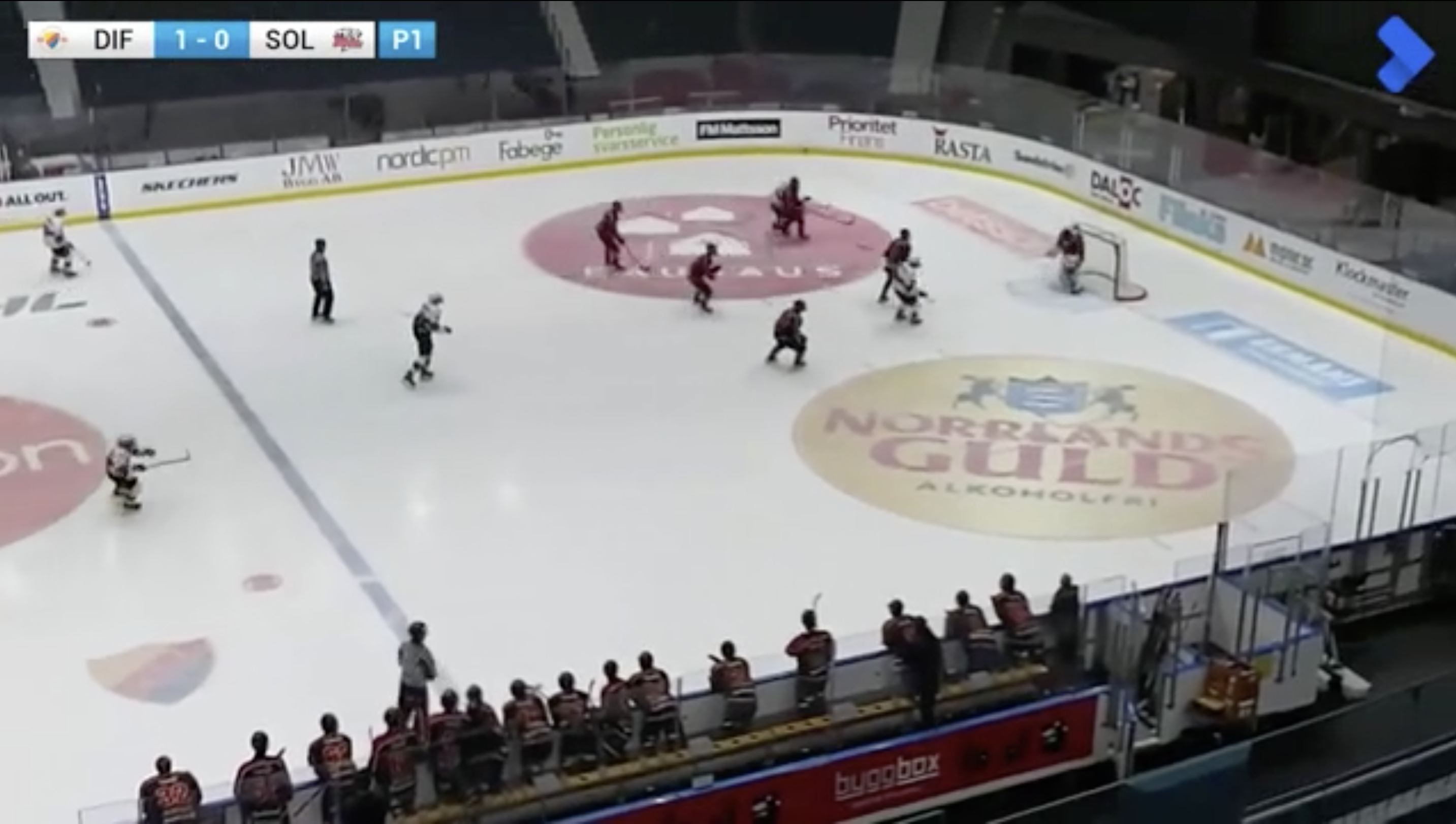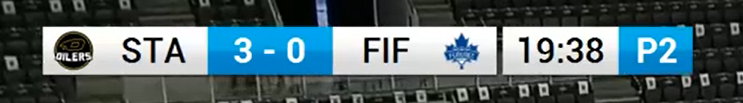 Scoreboard in top left corner contains home/away team, goal count, time (optional) and period counter.