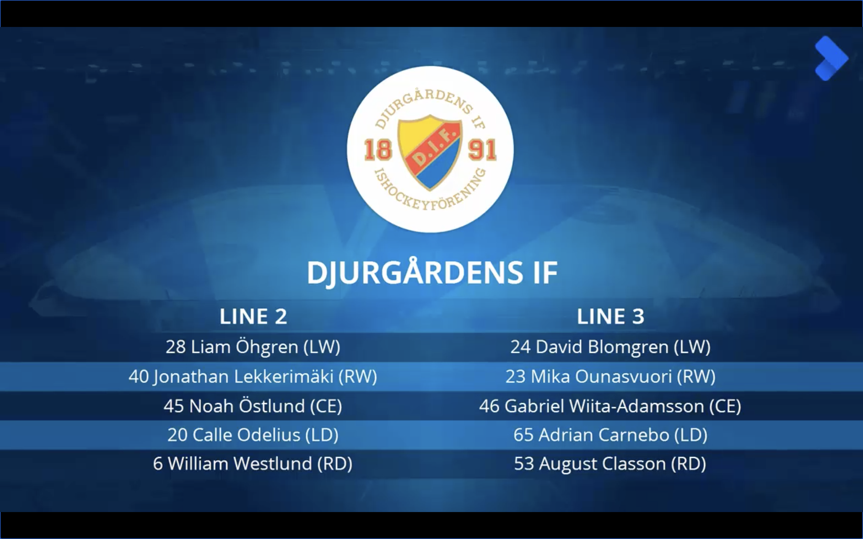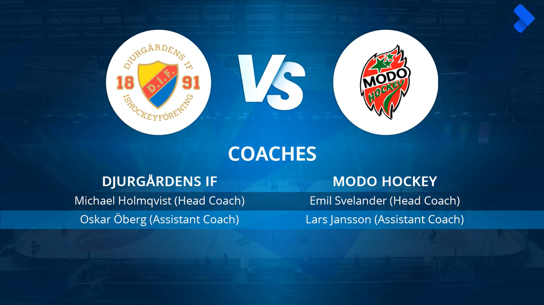 Automated graphics presenting location (arena), teams, referees, coaches and player lineups before the match starts.