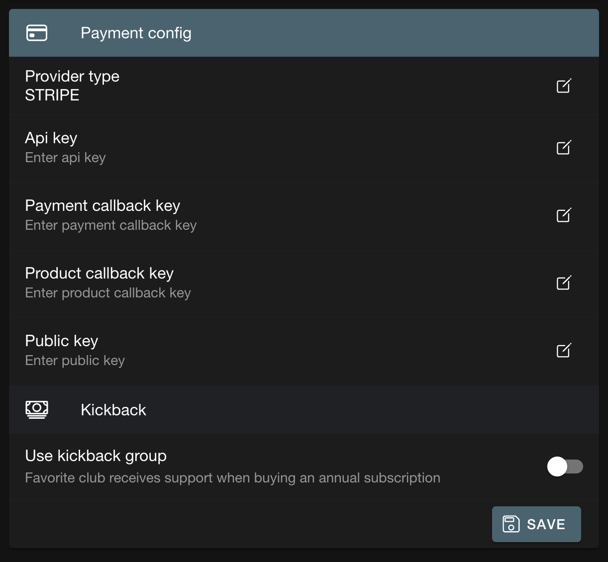 Firstly, you need to copy the API keys from Stripe into the Payment Config in BackOffice (found under the section Super Admin & Sites).