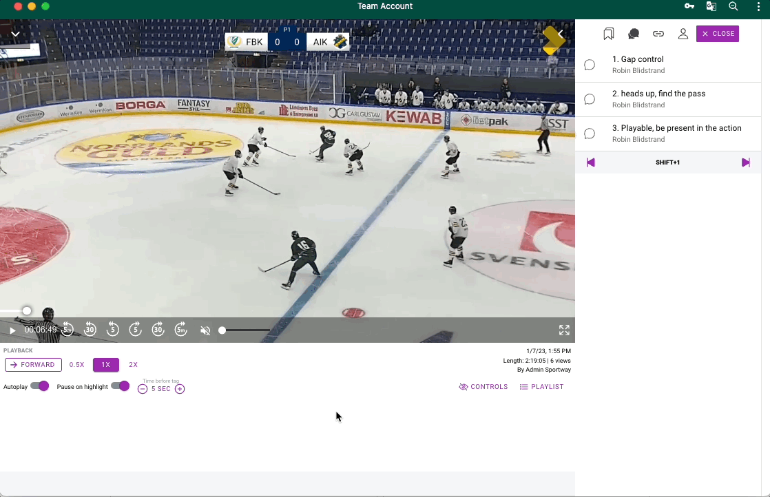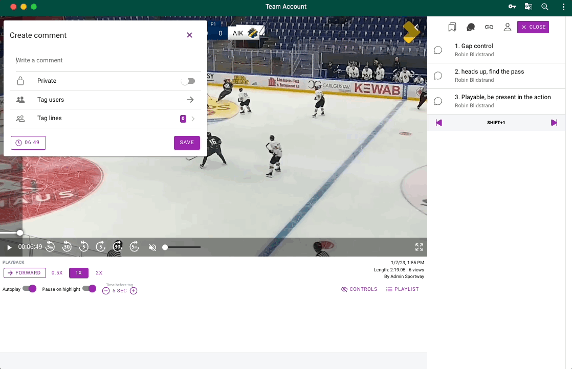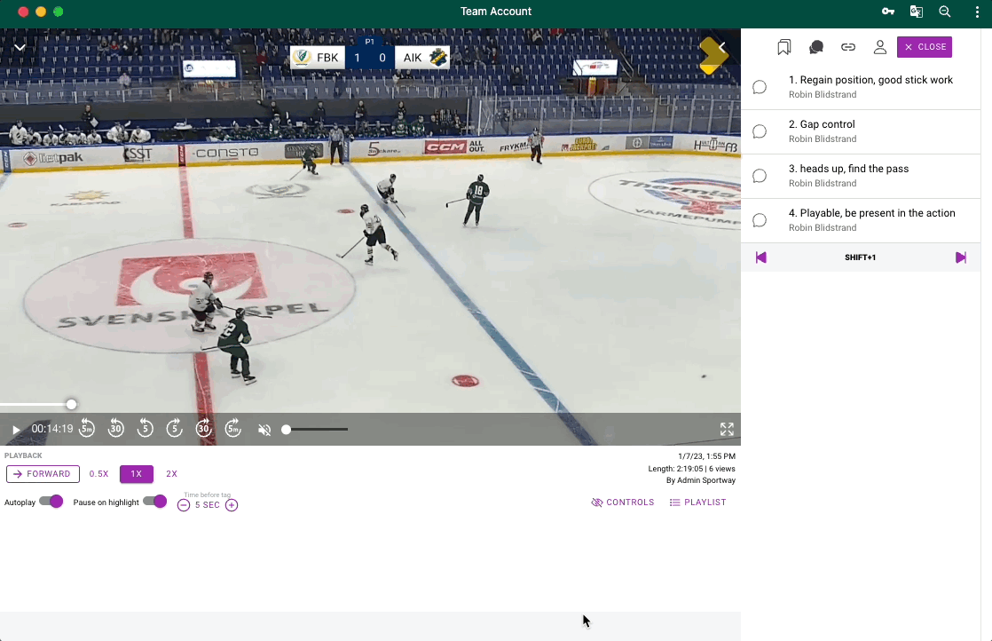 As a coach you will see all comments created by you. Players will se all comments that they are mentioned in. Click on a comment to watch the video. Use arrows up and down on your keyboard to jump between clips or use your mouse.