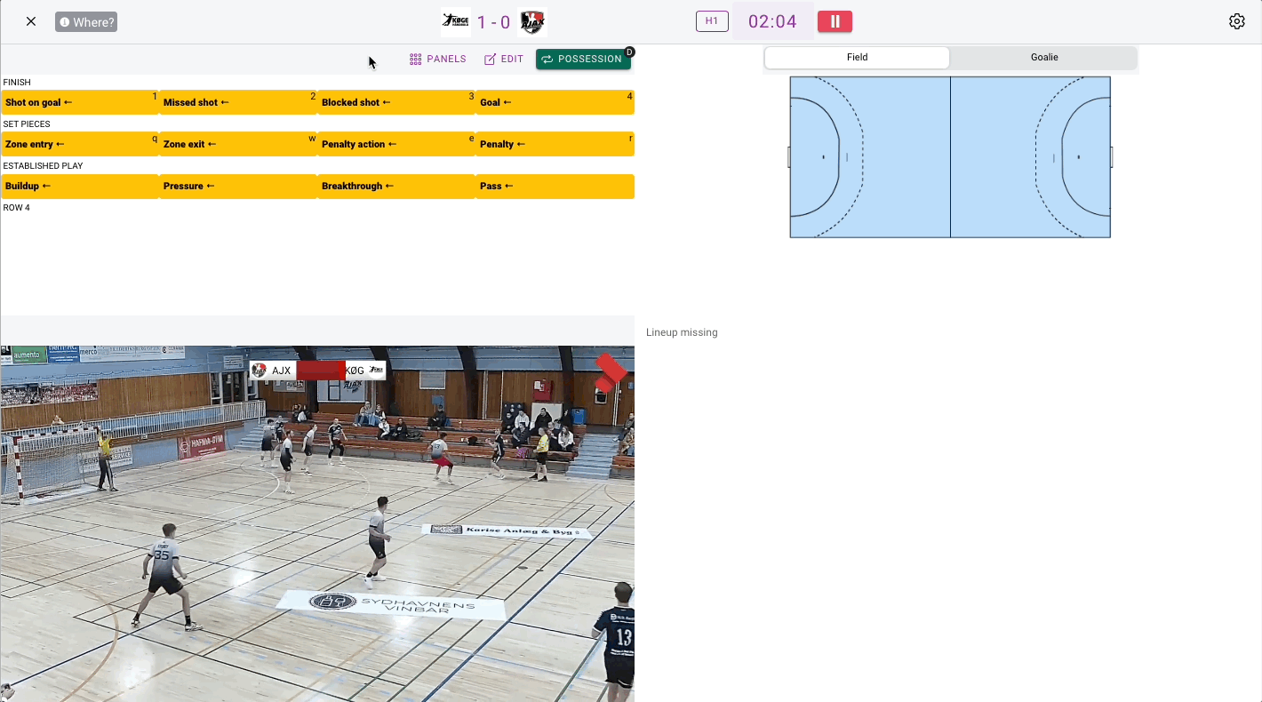 For handball if you have goalie tags activated and you tag shot on goal or a goal the goal will show up first. Click where the shot went on the goal and then where the shot was taken from.