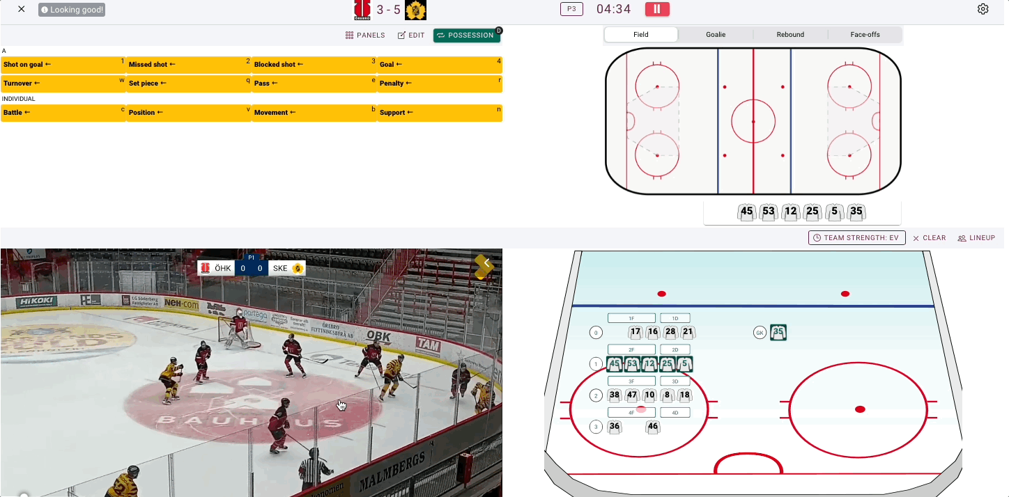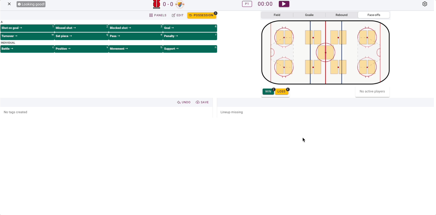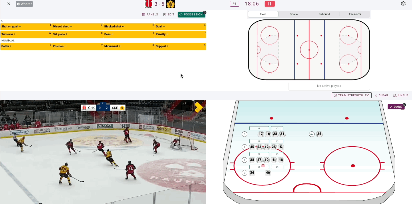 Also for ice hockey there is rebound analysis. If this is activated it will only show up when a shot on goal is tagged. If there is no rebound, click on the no rebound button.