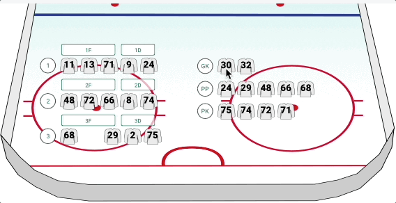 Easiest way to tag players on ice is by using your mouse. You can change full line by clicking on the line number, forwards and defense by the “F” and “D” buttons and individually by clicking on the player.