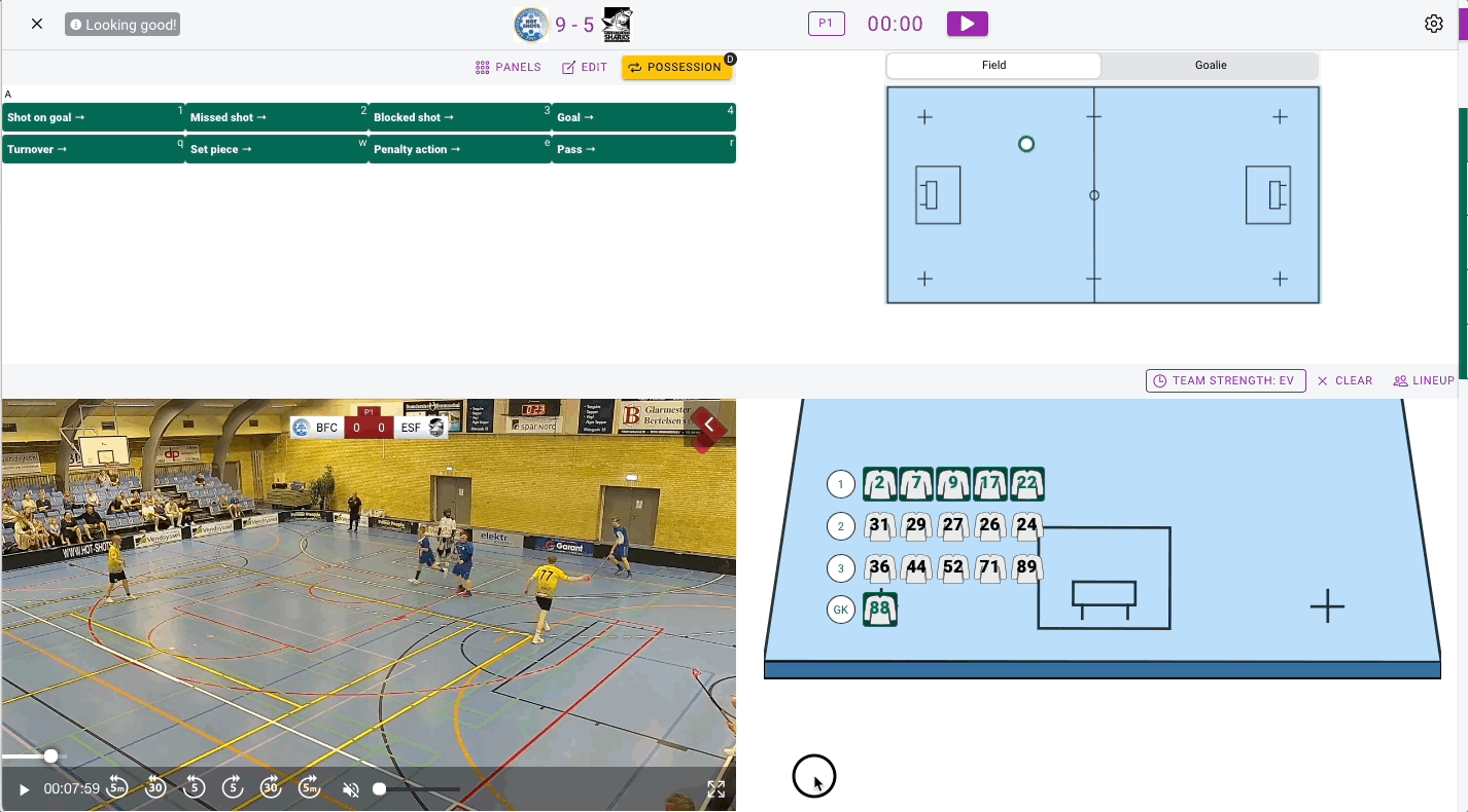 To all events you tag (f.e shots, turnovers, passes etc) you can add a player to it. When you tag an event a timer will show up next to your line up. It shows how much time is left before the tag is saved. During the timer counts down you can click on the players you want to add to that event. If you want to close the timer before it runs out, click on it or use s on your keyboard.