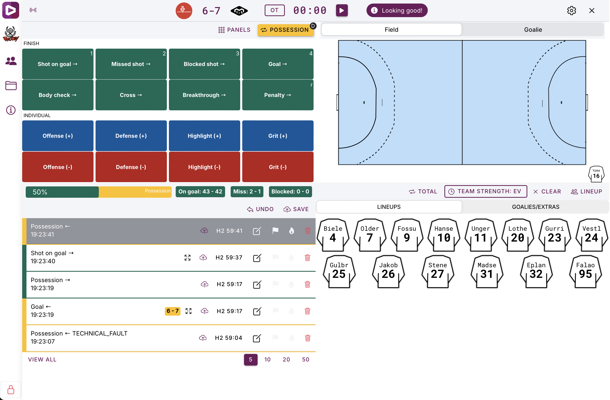 We offer multiple ways of tagging events in games and practices both live on the venue or remote. For practice videos tagging makes it easier to find clips for feedback.